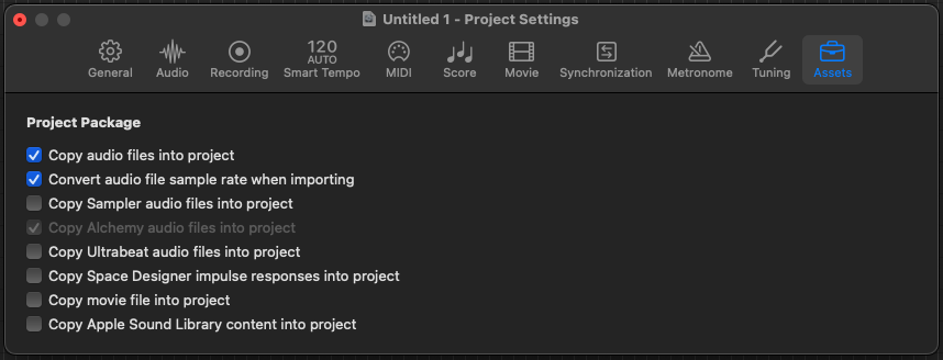 -b)Open Project Preferences. Check "Copy audio files into project". If you are using custom samples in Sampler or QuickSampler check "Copy Sampler audio files into project". The same goes for any custom IR's in Space Designer, etc. Save the project.
